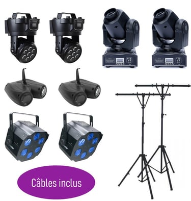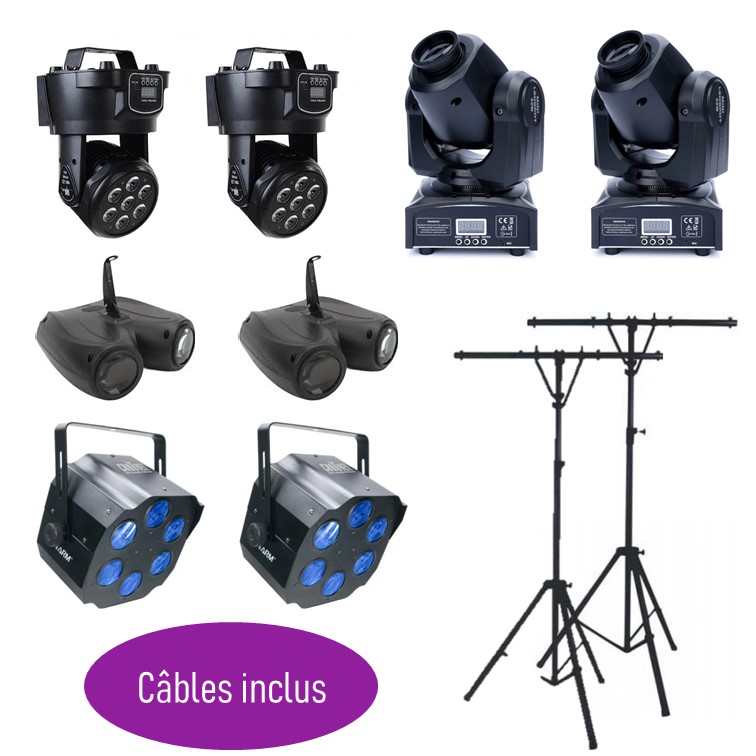 Inox Event Location vous propose son pack lumière 300, idéal pour vos événements publics dans des grands espaces comme des halles d’exposition ou des salles de spectacles. Il peut éclairer un espace allant jusqu’à 450m², soit 300 personnes. Ce qui complète la prestation de votre DJ ou groupe de musique lors de soirées étudiantes, concerts ou bals. Ce pack est composé de quatre pièces maîtresses et de deux projecteurs d’ambiance mobiles. Il se différencie par sa grande couverture et ses multiples effets lumineux. Une assistance technique téléphonique sera proposée durant la location. Plusieurs options sont disponibles pour compléter ce pack.