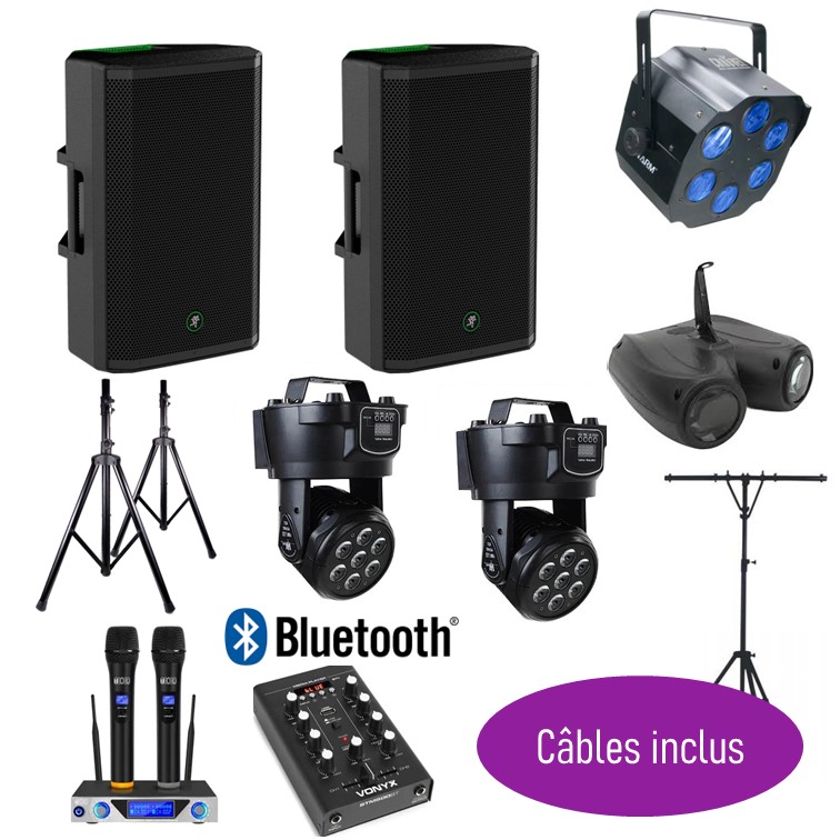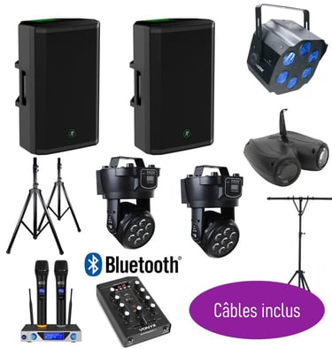 Inox Event Location vous propose son mariage 100, idéal pour les soirées de mariage accueillant jusqu'à 100 convives. C’est la solution complète pour sonoriser et éclairer votre espace de danse dans une salle allant jusqu’à 130m². Ce pack est composé de 2 enceintes amplifiées large, 4 jeux de lumière, 2 micros sans fil et une table de mixage Bluetooth vous permettant de connecter votre téléphone sans fil à la sono. Ce pack permet une restitution puissante et marquée de votre musique. Une assistance technique téléphonique sera proposée durant la location. Plusieurs options sont disponibles pour compléter ce pack.