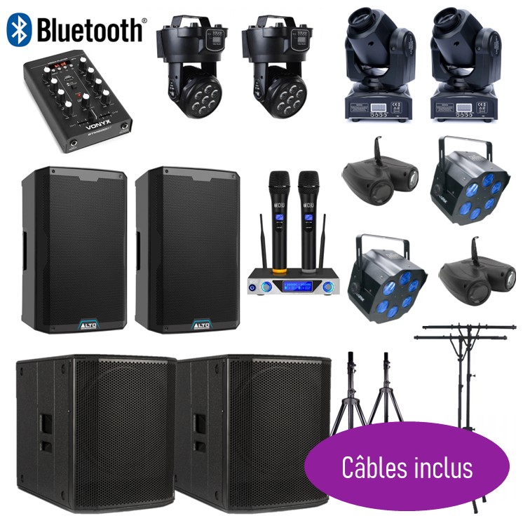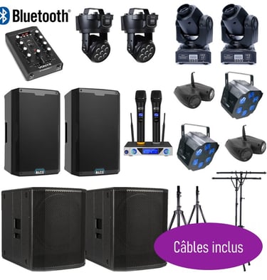 Inox Event Location vous propose son pack mariage 300, idéal pour les soirées de mariage accueillant jusqu'à 300 convives. C’est la solution complète pour sonoriser et éclairer votre espace de danse dans une salle allant jusqu’à 400m². Ce pack est composé de 2 enceintes amplifiées large, 4 jeux de lumière, 2 micros sans fil et une table de mixage Bluetooth vous permettant de connecter votre téléphone sans fil à la sono. Ce pack permet une restitution puissante et marquée de votre musique. Une assistance technique téléphonique sera proposée durant la location. Plusieurs options sont disponibles pour compléter ce pack.