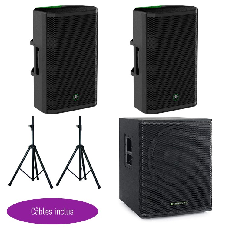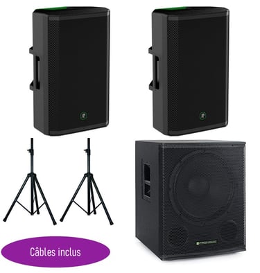 Inox Event Location vous propose son pack sono 150 semi-pro, idéal pour vos petits événements publics dans des espaces moyens comme des salles de fêtes ou des espaces extérieurs. Ce set délivre 1650 watts RMS de puissance, il peut sonoriser un espace allant jusqu’à 190m², soit 150 personnes. Ce pack est composé de 2 enceintes amplifiées large bande Mackie Thrash 212 et d’un caisson actif Pronomic SA-18. Ce set offre une réponse en fréquence de 26 Hz à 20 kHz (-10 dB) et un SPL max de 126 dB. Avec des membranes de 12’ sur les enceintes et de 18’ sur le caisson, ce pack permet une restitution riche et marquée des basses et medium-bas qui le rend idéal pour les prestations DJ. Plusieurs options sont disponibles pour compléter ce pack.